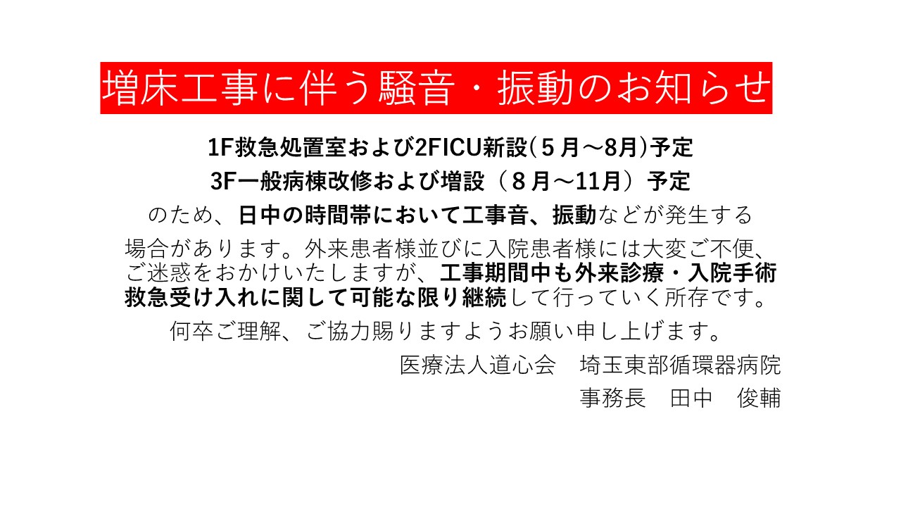 「医療法人道心会 埼玉東部循環器病院」は、より充実した急性期医療・救急医療体制の確保のため、病院の改修工事を行っております。工事期間中は工事作業に伴う、騒音や振動が発生する場合があります。